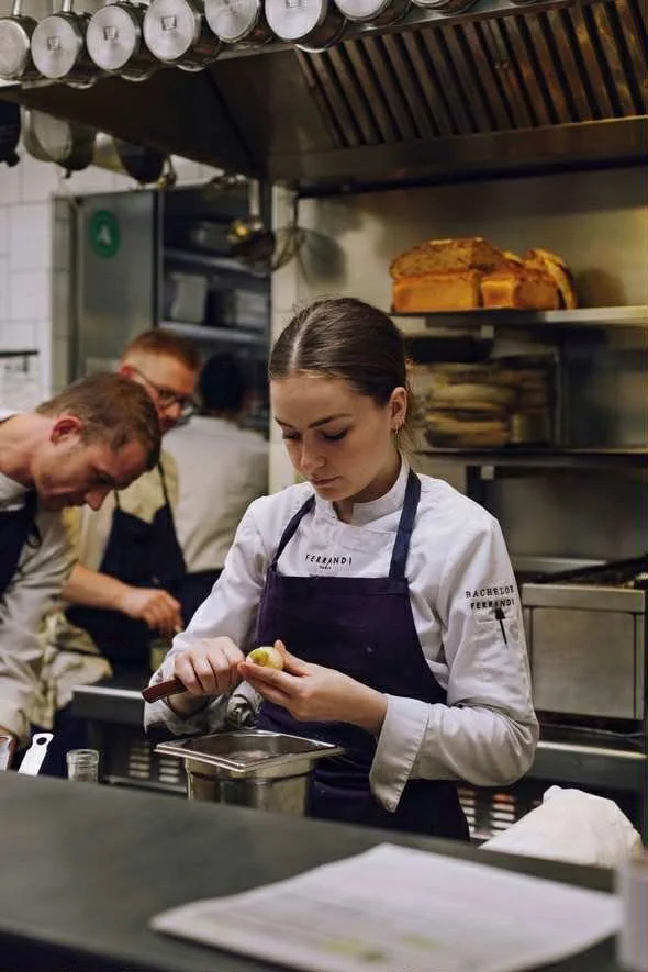 Elise est une cheffe qui aime bouger, créer et surprendre. Après l’école Ferrandi à Bordeaux, elle apprend la pâtisserie dans des restaurants comme les Prés d’Eugénie ou le Plaza Athénée. Lors d’une expérience en Suède, elle découvre sa passion pour le salé. De retour en France, elle passe trois ans chez Septime à Paris où elle développe une cuisine à la fois fine, durable et proche du végétal.